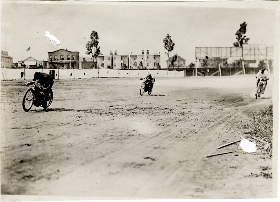 View of men racing motorcycles on track during 1 hour motorcycle race. Stamped on back: "Photo by Spooner & Wells, Inc. 1931 Broadway, N.Y." Handwritten on back: "1 hr. motorcycle race. Motorcycles."