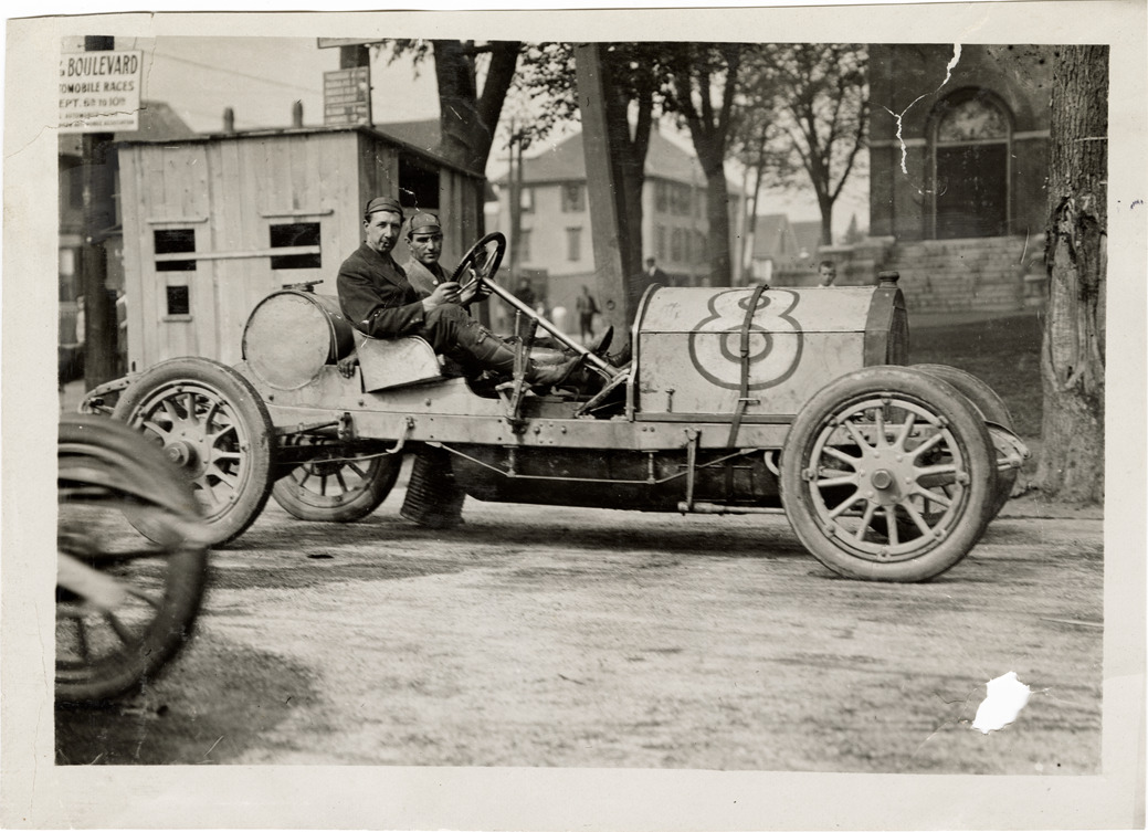 View of driver Fred Belcher and passenger posing in Knox car no. 8 during the 1909 Lowell road race. Stamped on back: "Photo by Spooner & Wells, Inc. 1931 Broadway, N.Y." Handwritten on back: "Knox, Belcher. Races and racing--Lowell road race, 1909."