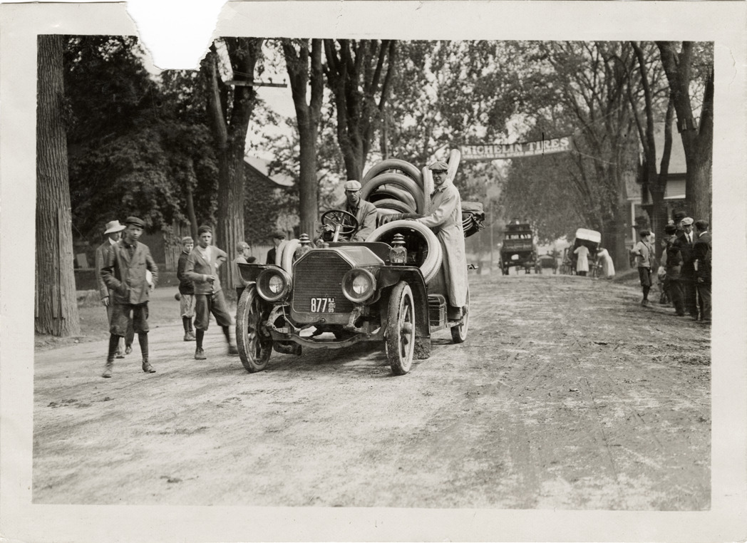 View of motorists posing with a car carrying tires during the 1909 Lowell road race. "Michelin tires" banner is displayed over street in background. Stamped on back: "Photo by Spooner & Wells, Inc. 1931 Broadway, N.Y." Handwritten on back: "Tire car. Races and racing--Lowell road race, 1909."