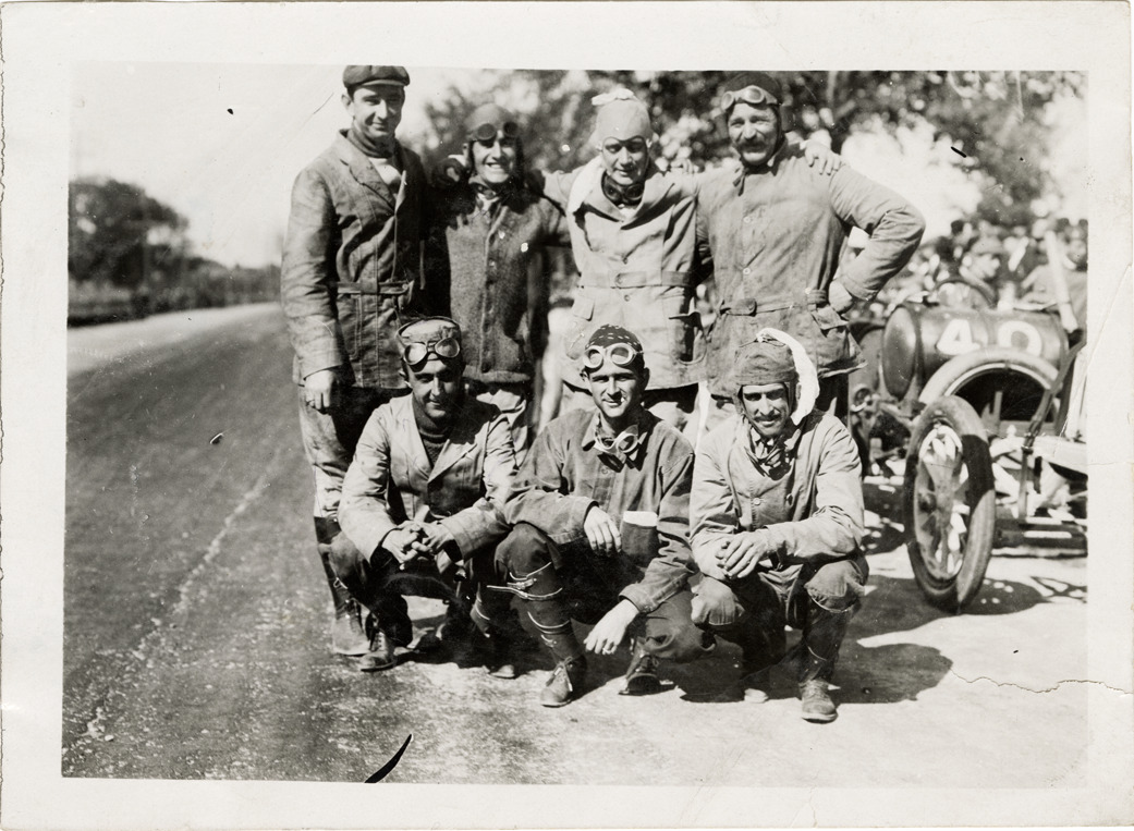 Group portrait of Buick drivers Bob Burman, Louis Strang, Louis Chevrolet, George DeWitt, Louis Disbrow and others during the 1909 Lowell road race. Stamped on back: "Photo by Spooner & Wells, Inc. 1931 Broadway, N.Y." Handwritten on back: "All the Buick drivers, Burman, Strang, Chevrolet, DeWitt, Disbrow. Races and racing--Lowell road race, 1909."