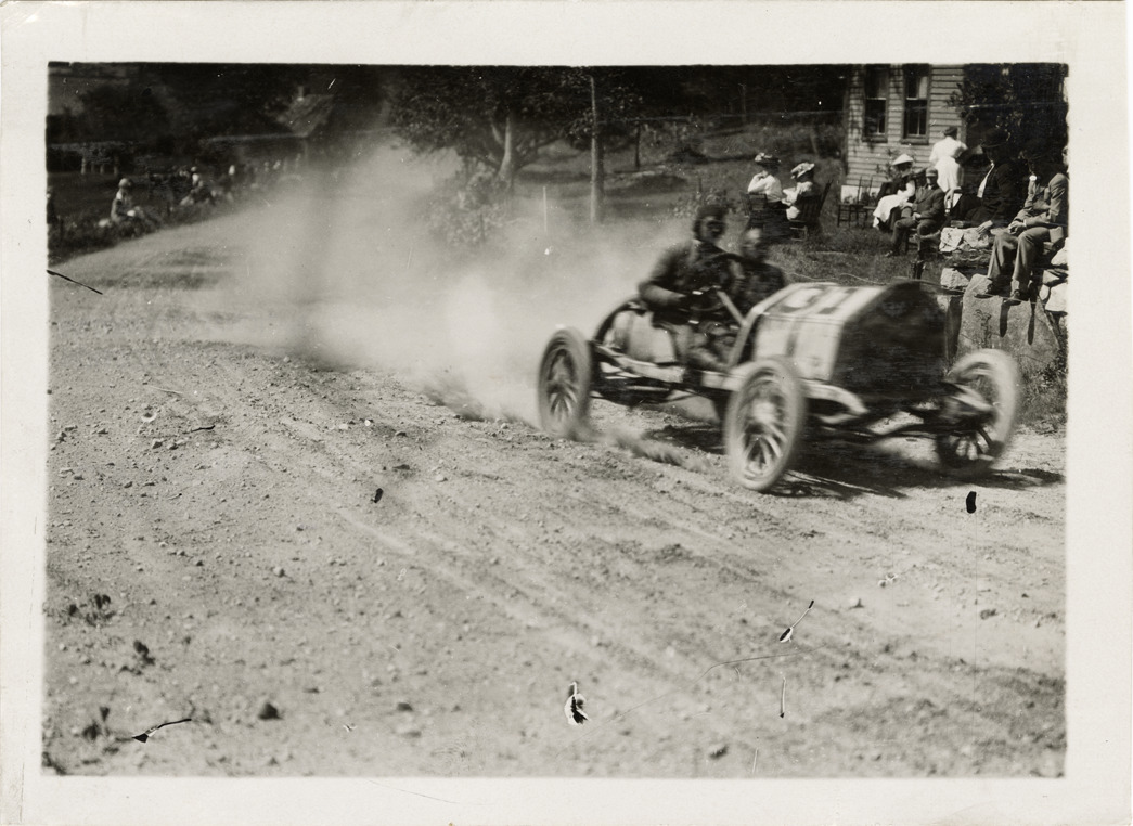 View of Louis Chevrolet driving Buick car no. 31 past spectators on roadside during the 1909 Lowell road race. Stamped on back: "Photo by Spooner & Wells, Inc. 1931 Broadway, N.Y." Handwritten on back: "Chevrolet in Buick. Races and racing--Lowell road race, 1909."