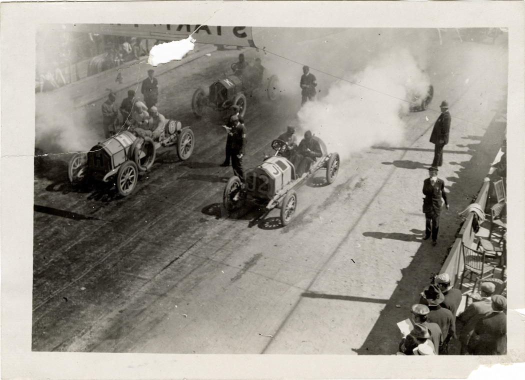 Racecars at start, 1909 Lowell road race