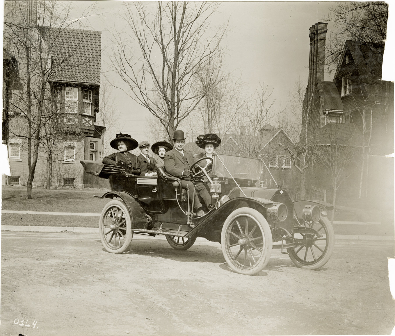 View of motorists posing in an Everitt car. Houses in background. Handwritten on back: "Everitt, ca. 1910."