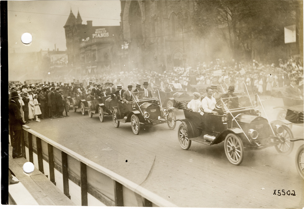 View of motorists driving Flanders electric cars in parade during Cadillaqua celebration in Detroit, Michigan. Stamped on back: "Spooner & Wells, Inc., photographers, 1231 Woodward Ave., Detroit, Mich., telephone North 1745." Handwritten on back: "Cadillaqua celebration, Detroit, 1912."
