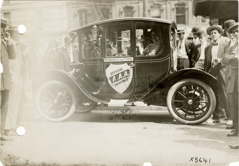 View of motorists in Flanders electric car in Detroit, Michigan, at the start of the pathfinding expedition for the 1912 Glidden Tour. The pathfinding tour covered a route from Detroit, Michigan to New Orleans, Louisiana, but the 1912 Glidden Tour was canceled. Handwritten on back: "Pathfinder leaving Detroit for New Orleans, 1912."