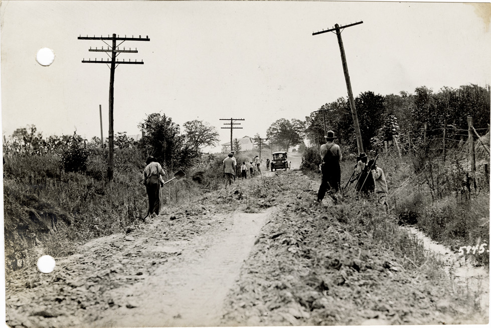 View of Flanders electric car traveling past road construction workers in Corinth, Mississippi, during the pathfinding expedition for the 1912 Glidden Tour. The pathfinding tour covered a route from Detroit, Michigan to New Orleans, Louisiana, but the 1912 Glidden Tour was canceled. Handwritten on back: "Manner of building good roads in the South. View near Corinth, dirt is simply thrown up from roadside and left for transportation to roll down. Pathfinding trip, 1912."