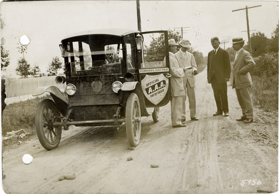 View of W.O. Westgard, E. LeRoy Pelletier, Charles Ross and F. Ed. Spooner standing next to Flanders electric car on rural dirt road near Memphis, Tennessee, during the pathfinding expedition for the 1912 Glidden Tour. The pathfinding tour covered a route from Detroit, Michigan to New Orleans, Louisiana, but the 1912 Glidden Tour was canceled. Stamped on back: "Spooner & Wells, Inc., photographers, 1231 Woodward Ave., Detroit, Mich., telephone North 1745." Handwritten on back: "Messrs. Pelletier, Spooner, Ross and Westgard hold a roadside consultation near Memphis, Tenn., 1912."