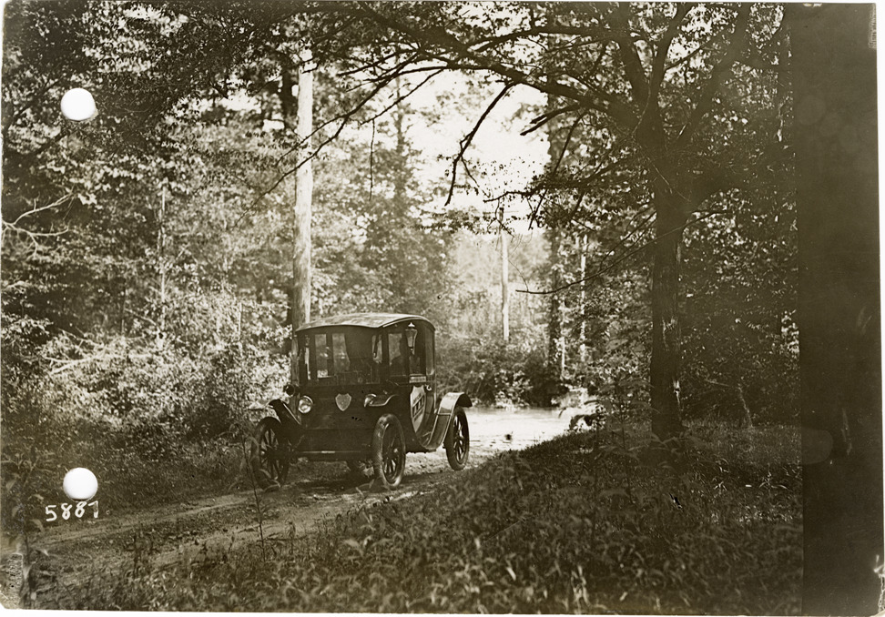 View of Flanders electric car crossing a stream near Lawrenceburg, Tennessee during the pathfinding expedition for the 1912 Glidden Tour. The pathfinding tour covered a route from Detroit, Michigan to New Orleans, Louisiana, but the 1912 Glidden Tour was canceled. Stamped on back: "Spooner & Wells, Inc., photographers, 1231 Woodward Ave., Detroit, Mich., telephone North 1745." Handwritten on back: "Eighteen inch deep ford, near Lawrenceburg, Tenn. in background of Pathfinder, 1912."