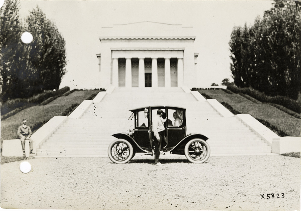 View of Flanders electric car in front of the Abraham Lincoln Memorial building at Hodgenville, Kentucky during the pathfinding expedition for the 1912 Glidden Tour. The pathfinding tour covered a route from Detroit, Michigan to New Orleans, Louisiana, but the 1912 Glidden Tour was canceled. Handwritten on back: "Pathfinder at Lincoln Memorial, 1912."