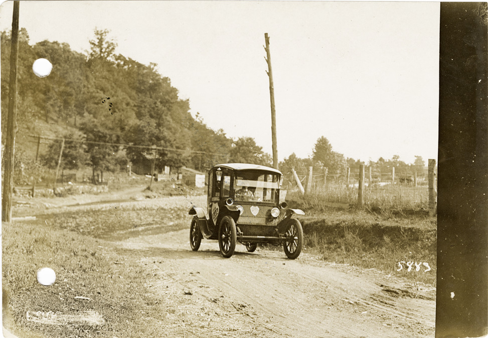 View of Flanders electric car traveling in valley of Big Bigby Creek in Tennessee during the pathfinding expedition for the 1912 Glidden Tour. The pathfinding tour covered a route from Detroit, Michigan to New Orleans, Louisiana, but the 1912 Glidden Tour was canceled. Stamped on back: "Spooner & Wells, Inc., photographers, 1231 Woodward Ave., Detroit, Mich., telephone North 1745." Handwritten on back: "Pathfinder in valley of Big Bigbee [sic] Creek, Tenn., 1912."
