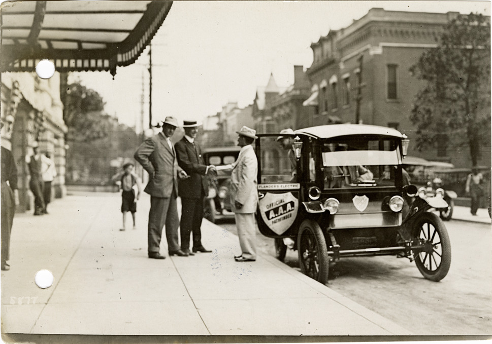 View of W.O. Westgard greeting two men on sidewalk in front of Flanders electric car at Nashville, Tennessee during the pathfinding expedition for the 1912 Glidden Tour. The pathfinding tour covered a route from Detroit, Michigan to New Orleans, Louisiana, but the 1912 Glidden Tour was canceled. Handwritten on back: "Pathfinders arrival in Nashvillle, in natty suits, 1912."