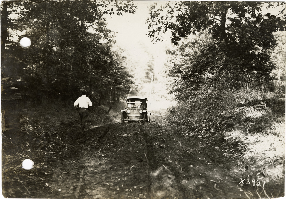 View of Flanders electric car on a hill during the pathfinding expedition for the 1912 Glidden Tour. The pathfinding tour covered a route from Detroit, Michigan to New Orleans, Louisiana, but the 1912 Glidden Tour was canceled. Stamped on back: "Spooner & Wells, Inc., photographers, 1231 Woodward Ave., Detroit, Mich., telephone North 1745." Handwritten on back: "Pathfinder on new made hill near Grand Junction, 1912."