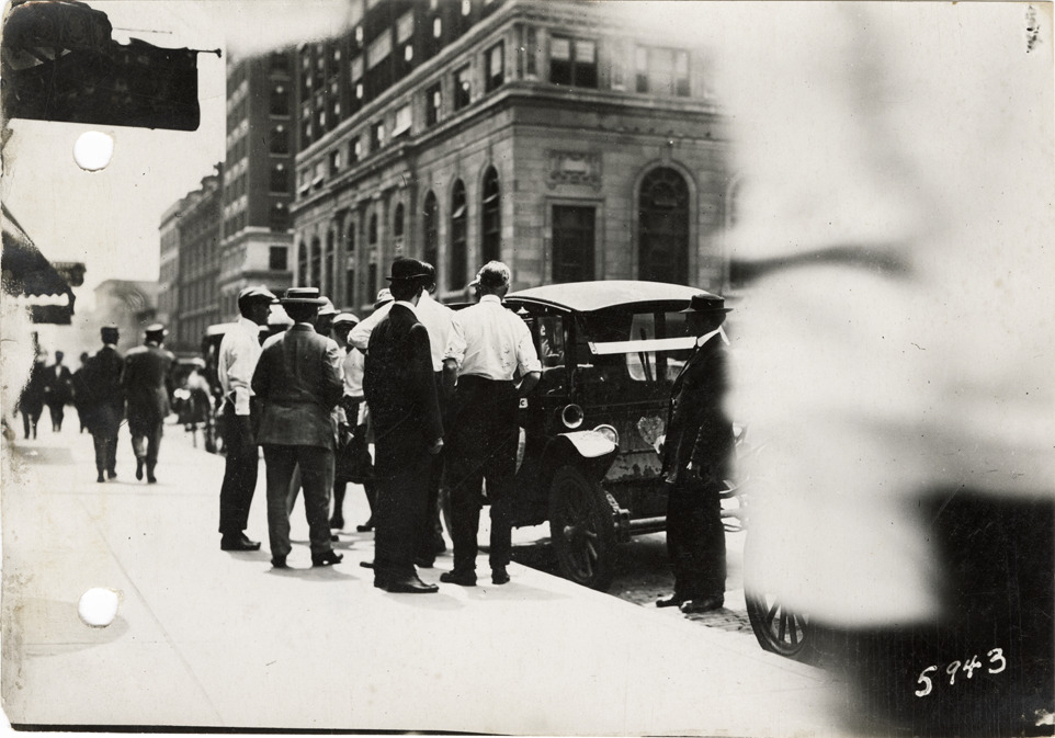View of motorists with Flanders electric car at Memphis, Tennessee during the pathfinding expedition for the 1912 Glidden Tour. The pathfinding tour covered a route from Detroit, Michigan to New Orleans, Louisiana, but the 1912 Glidden Tour was canceled. Stamped on back: "Spooner & Wells, Inc., photographers, 1231 Woodward Ave., Detroit, Mich., telephone North 1745." Handwritten on back: "Pathfinder arrives at Memphis, Tenn., 1912."