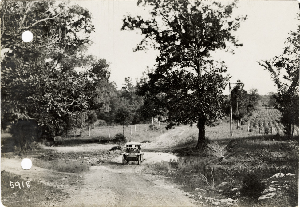 View of Flanders electric car traveling on rural dirt road near Iuka, Mississippi during the pathfinding expedition for the 1912 Glidden Tour. The pathfinding tour covered a route from Detroit, Michigan to New Orleans, Louisiana, but the 1912 Glidden Tour was canceled. Handwritten on back: "Pathfinder ten miles from Iuka, Miss., 1912."