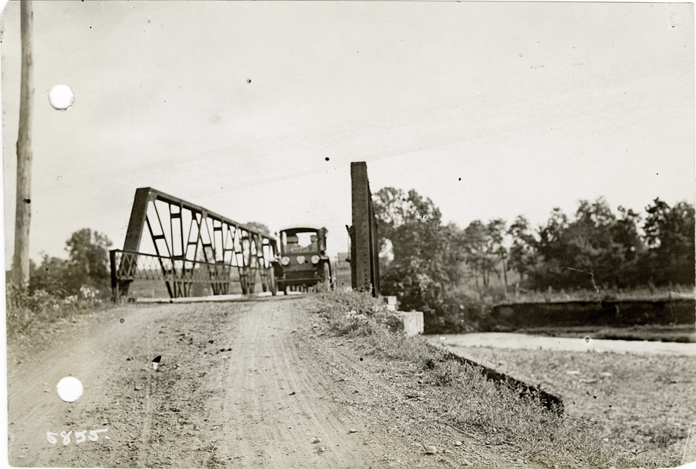 View of Flanders electric car crossing the Bigbee River Bridge in Alabama during the pathfinding expedition for the 1912 Glidden Tour. The pathfinding tour covered a route from Detroit, Michigan to New Orleans, Louisiana, but the 1912 Glidden Tour was canceled. Stamped on back: "Spooner & Wells, Inc., photographers, 1231 Woodward Ave., Detroit, Mich., telephone North 1745." Handwritten on back: "Pathfinder across Bigbee River bridge, 1912."