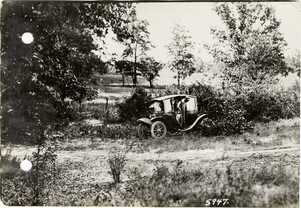 View of Flanders electric car on roadside near Moscow, Tennessee during the pathfinding expedition for the 1912 Glidden Tour. The pathfinding tour covered a route from Detroit, Michigan to New Orleans, Louisiana, but the 1912 Glidden Tour was canceled. Handwritten on back: "The discovery of the main road, once more near Moscow, Tenn. Pathfinding trip, 1912."