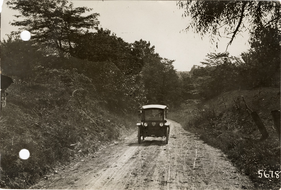 View of Flanders electric car traveling on rural dirt road near Indianapolis, Indiana during the pathfinding expedition for the 1912 Glidden Tour. The pathfinding tour covered a route from Detroit, Michigan to New Orleans, Louisiana, but the 1912 Glidden Tour was canceled. Handwritten on back: "Pathfinder over the crown of the hills, 12 miles from Indianapolis, 1912."