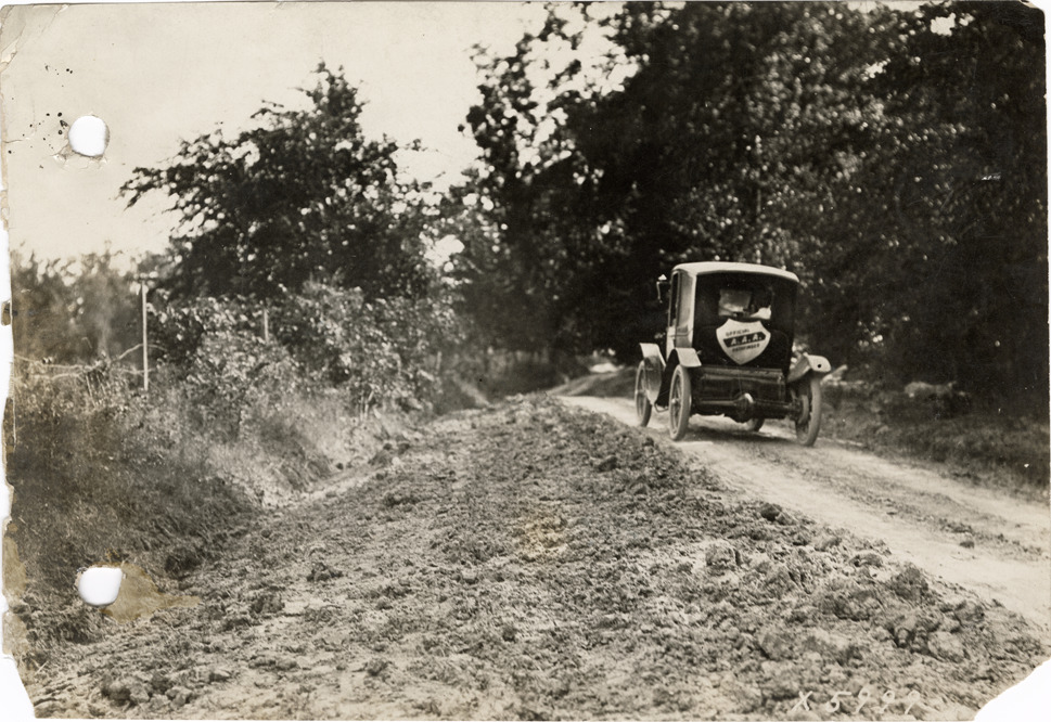 View of Flanders electric car traveling on a rural dirt road near Greenwood, Mississippi during the pathfinding expedition for the 1912 Glidden Tour. The pathfinding tour covered a route from Detroit, Michigan to New Orleans, Louisiana, but the 1912 Glidden Tour was canceled. Stamped on back: "Spooner & Wells, Inc., photographers, 1231 Woodward Ave., Detroit, Mich., telephone North 1745." Handwritten on back: "Pathfinder four miles from Greenwood, Miss., 1912."