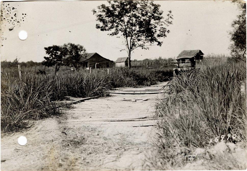 View of Flanders electric car crossing a wooden bridge near Greenwood, Mississippi during the pathfinding expedition for the 1912 Glidden Tour. The pathfinding tour covered a route from Detroit, Michigan to New Orleans, Louisiana, but the 1912 Glidden Tour was canceled. Handwritten on back: "Bridge three miles from Greenwood, 1912. Pathfinding trip."