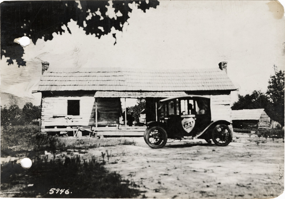 View of Flanders electric car parked in front of a log cabin near Moscow, Tennessee during the pathfinding expedition for the 1912 Glidden Tour. The pathfinding tour covered a route from Detroit, Michigan to New Orleans, Louisiana, but the 1912 Glidden Tour was canceled. Stamped on back: "Spooner & Wells, Inc., photographers, 1231 Woodward Ave., Detroit, Mich., telephone North 1745." Handwritten on back: "Pathfinder in front of typical two room log cabin taken near Moscow, Tenn., 1912."