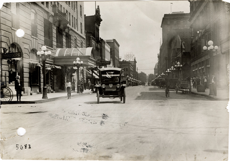 View of Flanders electric car in Fort Wayne, Indiana during the pathfinding expedition for the 1912 Glidden Tour. The pathfinding tour covered a route from Detroit, Michigan to New Orleans, Louisiana, but the 1912 Glidden Tour was canceled. Stamped on back: "Spooner & Wells, Inc., photographers, 1231 Woodward Ave., Detroit, Mich., telephone North 1745." Handwritten on back: "Pathfinder in Fort Wayne, Ind."
