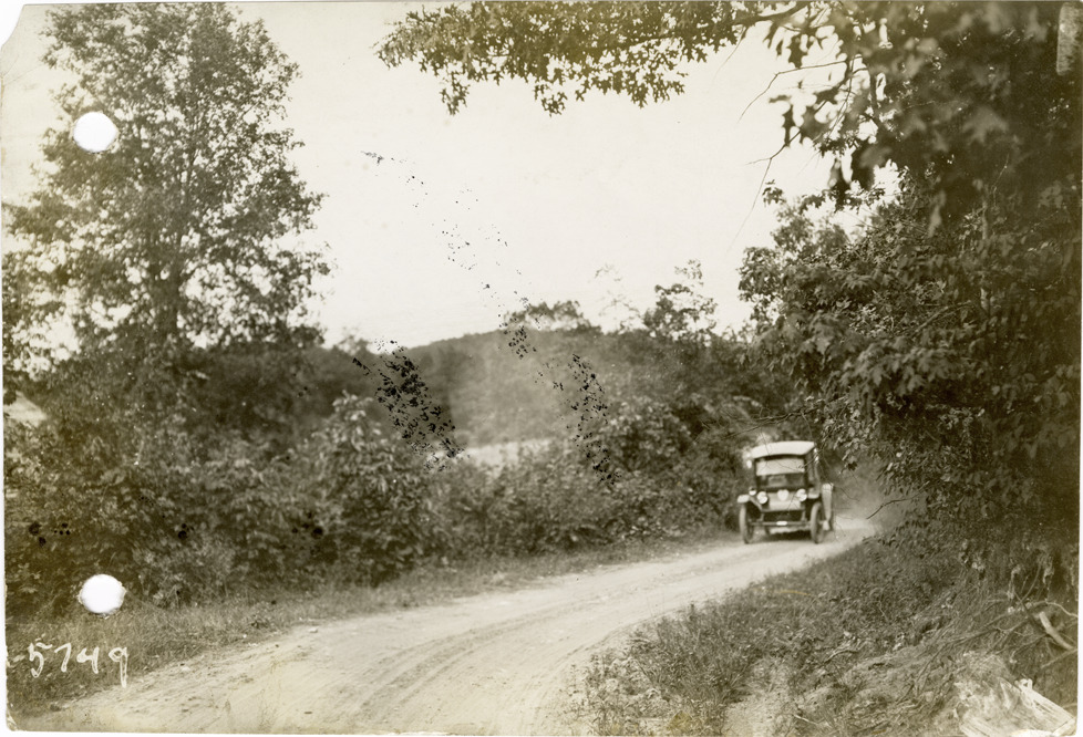View of Flanders electric car traveling on rural dirt road between Milltown and Salem, Indiana during the pathfinding expedition for the 1912 Glidden Tour. The pathfinding tour covered a route from Detroit, Michigan to New Orleans, Louisiana, but the 1912 Glidden Tour was canceled. Stamped on back: "Spooner & Wells, Inc., photographers, 1231 Woodward Ave., Detroit, Mich., telephone North 1745." Handwritten on back: "Pathfinder on three & one half mile hill between Milltown and Salem, Ind., 1912."