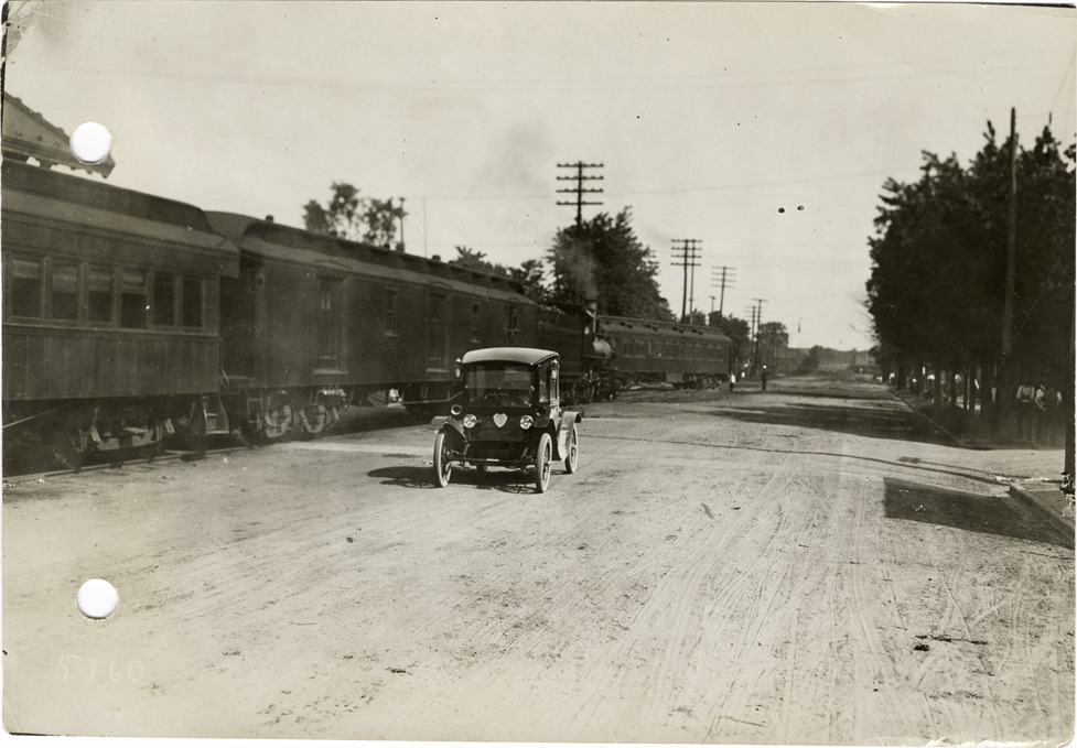 View of Flanders electric car parked at railroad station at Columbus, Indiana during the pathfinding expedition for the 1912 Glidden Tour. Railroad passenger cars on left. The pathfinding tour covered a route from Detroit, Michigan to New Orleans, Louisiana, but the 1912 Glidden Tour was canceled. Handwritten on back: "Pathfinder at Columbus, 1912."