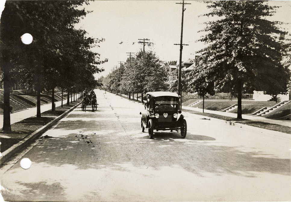 View of Flanders electric car on Cherokee Drive in Louisville, Kentucky, during the pathfinding expedition for the 1912 Glidden Tour. The pathfinding tour covered a route from Detroit, Michigan to New Orleans, Louisiana, but the 1912 Glidden Tour was canceled. Handwritten on back: "Pathfinder on Cherokee Drive, Louisville, Ky."