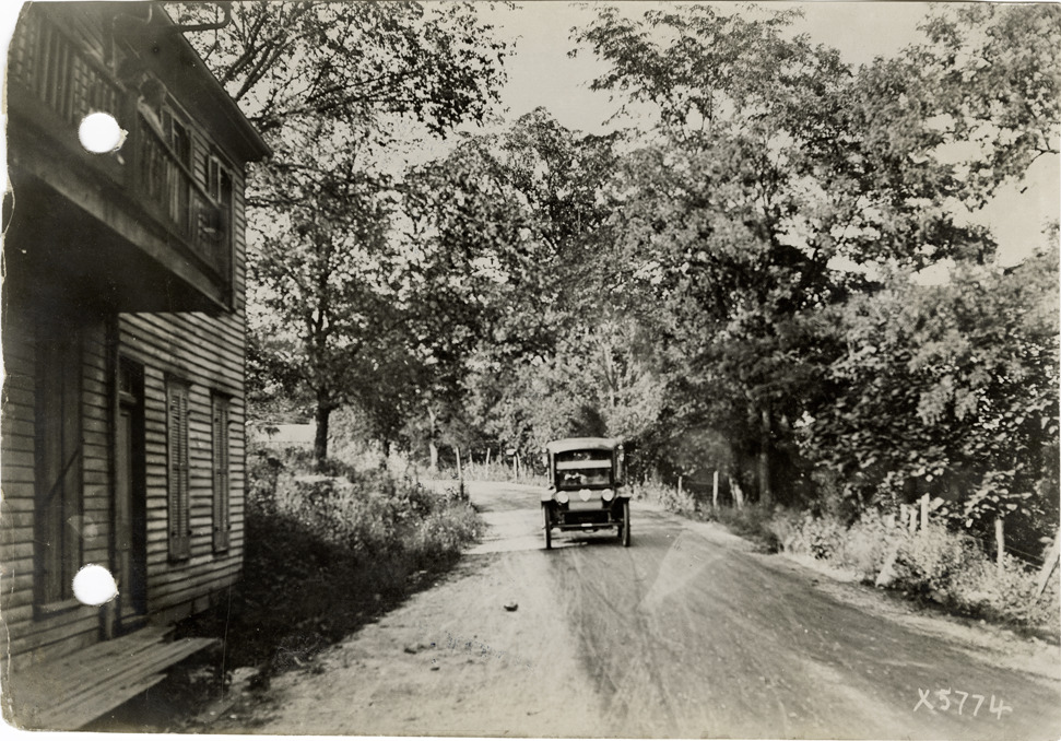 View of Flanders electric car traveling on the Bardstown Pike, near Louisville, Kentucky, during the pathfinding expedition for the 1912 Glidden Tour. Wooden-frame house on left. The pathfinding tour covered a route from Detroit, Michigan to New Orleans, Louisiana, but the 1912 Glidden Tour was canceled. Handwritten on back: "Pathfinder twenty miles from Louisville on Bardstown Pike, 1912."