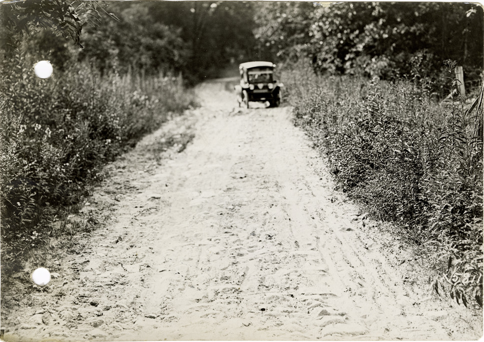 View of Flanders electric car traveling on sandy rural road during the pathfinding expedition for the 1912 Glidden Tour. The pathfinding tour covered a route from Detroit, Michigan to New Orleans, Louisiana, but the 1912 Glidden Tour was canceled. Handwritten on back: "Sand over rocks. Pathfinding trip, 1912."