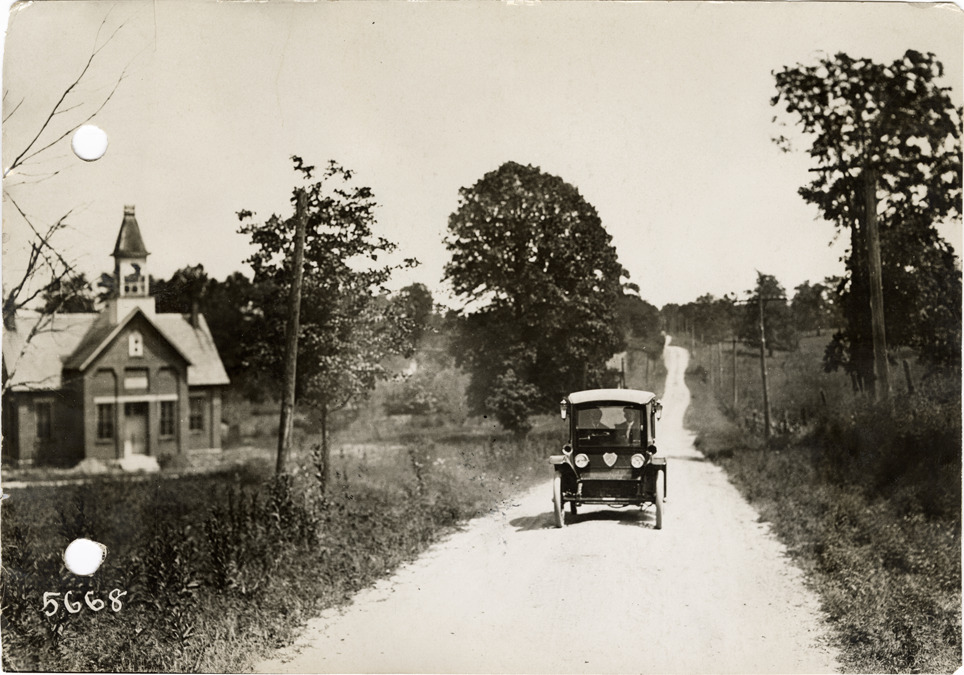 View of Flanders electric car traveling on rural dirt road in Maple Grove, Ohio during the pathfinding expedition for the 1912 Glidden Tour. Schoolhouse on left. The pathfinding tour covered a route from Detroit, Michigan to New Orleans, Louisiana, but the 1912 Glidden Tour was canceled. Handwritten on back: "Pathfinder through Maple Grove, near Otteka, Ohio, 1912."