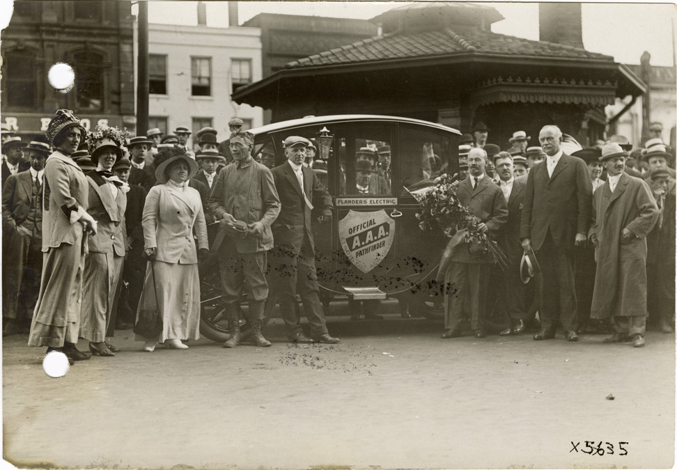 View of W.O. Westgard, Hazel Flanders and others, posing with Flanders electric car in Detroit, Michigan, at the start of the pathfinding expedition for the 1912 Glidden Tour. The pathfinding tour covered a route from Detroit, Michigan to New Orleans, Louisiana, but the 1912 Glidden Tour was canceled. Handwritten on back: "Pathfinder leaving Detroit for New Orleans, 1912."