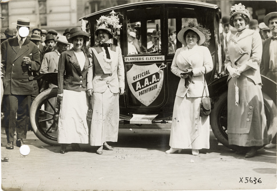 View of Hazel Flanders and several women posing next to Flanders electric car in Detroit, Michigan, at the start of the pathfinding expedition for the 1912 Glidden Tour. The pathfinding tour covered a route from Detroit, Michigan to New Orleans, Louisiana, but the 1912 Glidden Tour was canceled. Handwritten on back: "Pathfinder leaving Detroit for New Orleans, 1912."