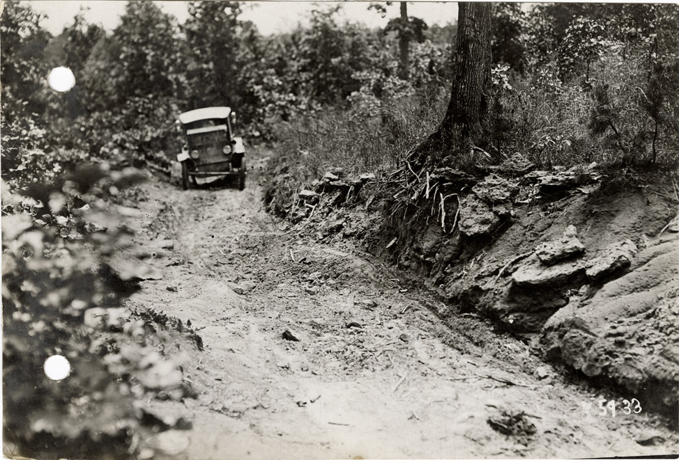 View of Flanders electric car traveling on a rural dirt road near Corinth, Mississippi during the pathfinding expedition for the 1912 Glidden Tour. The pathfinding tour covered a route from Detroit, Michigan to New Orleans, Louisiana, but the 1912 Glidden Tour was canceled. Handwritten on back: "Ticklish washout hill, 13 miles from Corinth. Pathfinding trip, 1912."