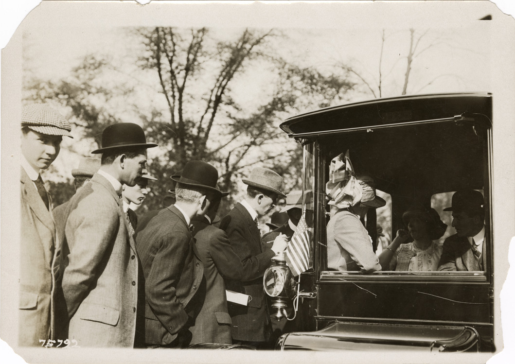 Close-up view of onlookers surrounding Flanders electric car. Stamped on back: "Spooner & Wells, Inc., photographers, 1931 Broadway, N.Y. City, phones 3472-3473 Col." Handwritten on back: "Flanders el., ca. 1912-13."
