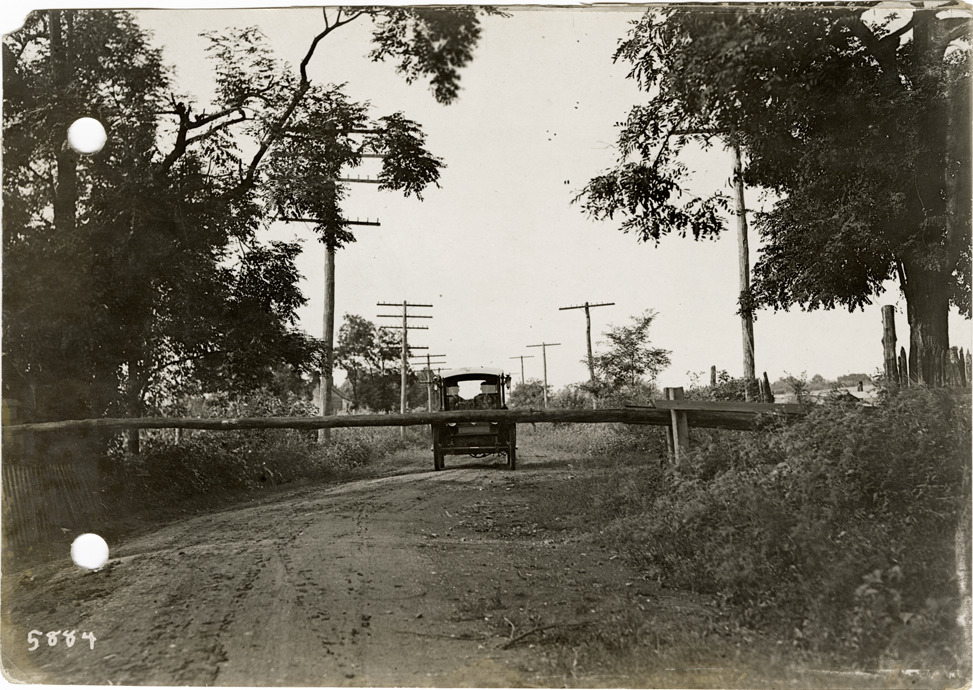 View of Flanders electric car at tollgate in Tennessee during the pathfinding expedition for the 1912 Glidden Tour. The pathfinding tour covered a route from Detroit, Michigan to New Orleans, Louisiana, but the 1912 Glidden Tour was canceled. Stamped on back: "Spooner & Wells, Inc., photographers, 1231 Woodward Ave., Detroit, Mich., telephone North 1745." Handwritten on back: "Pathfinder encounters toll gates every fifteen miles, Nashville to Columbia, Tenn., 1912."