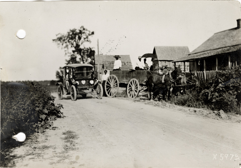View of Flanders electric car near Tunica, Mississippi during the pathfinding expedition for the 1912 Glidden Tour. Men with mule-drawn wagon on roadside. The pathfinding tour covered a route from Detroit, Michigan to New Orleans, Louisiana, but the 1912 Glidden Tour was canceled. Handwritten on back: "Clearing the road, three miles out of Tunica, Miss. Pathfinding trip, 1912,"