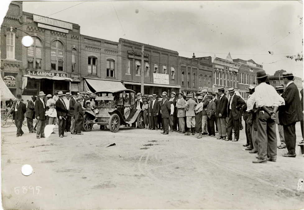 View of crowd surrounding Flanders electric car at Florence, Alabama during the pathfinding expedition for the 1912 Glidden Tour. The pathfinding tour covered a route from Detroit, Michigan to New Orleans, Louisiana, but the 1912 Glidden Tour was canceled. Handwritten on back: "Pathfinder in Florence, Ala., Sunday, 1912."