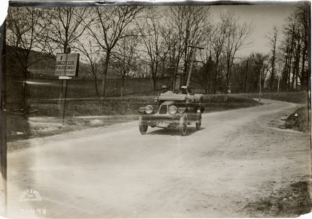 View of motorists traveling in a Franklin car. Sign in foreground reads: "Motor Parkway, lodge entrance." Stamped on back: "Spooner & Wells, Inc., photographers, telephones 3472-3473 Columbus, 1931 Broadway, New York." Handwritten on back: "Franklin."