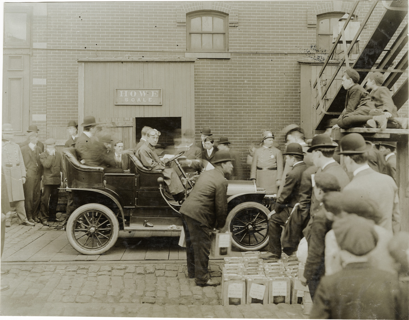 View of Hugh Easter with a Franklin car, surrounded by onlookers. Car is being weighed on Howe scale. Fuel cans in foreground. Stamped on back: "Photo by F. Ed. Spooner, 1536 B'way, telephone 6536-38th St., New York, N.Y." Handwritten on back: "Hugh Easter, Franklin. Franklin, ca. '06."