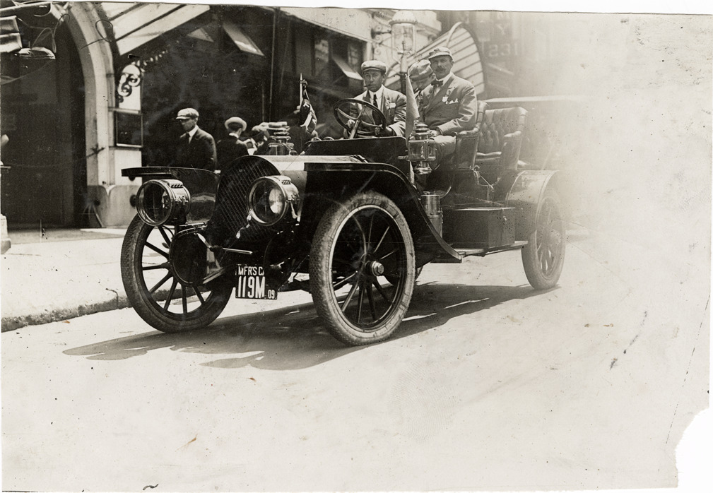 View of motorists posing in Franklin car. Stamped on back: "Spooner & Wells, Inc., photographers, telephones 3472-3473 Columbus, 1931 Broadway, New York." Handwritten on back: "Franklin, ca. 1909."