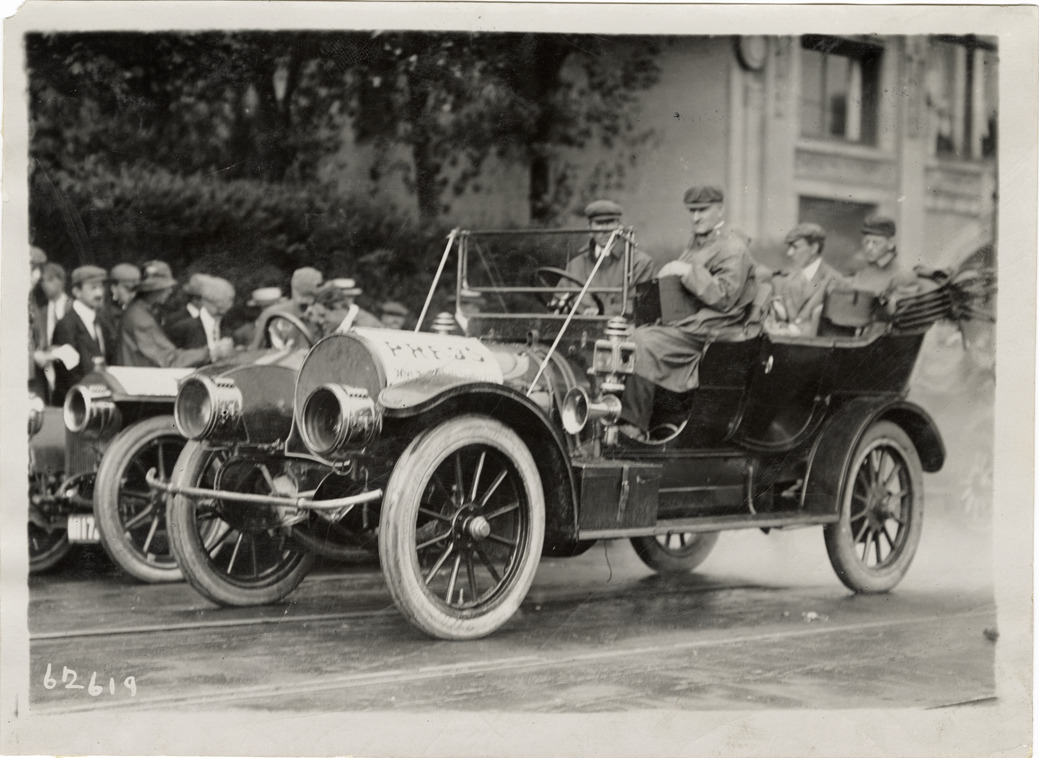 View of motorists posing in a Franklin press car. Stamped on back: "Spooner & Wells, Inc., photographers, telephones 3472-3473 Columbus, 1931 Broadway, New York." Handwritten on back: "Franklin, ca. '10."