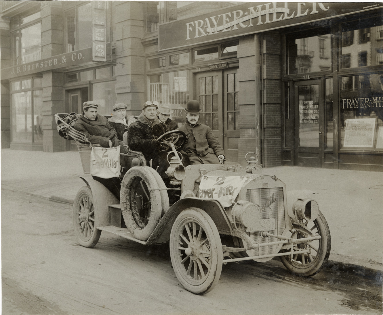 View of motorists posing in a Frayer-Miller car. Frayer-Miller car dealership in background. Handwritten on back: "Frayer-Miller, ca. 1906-7."
