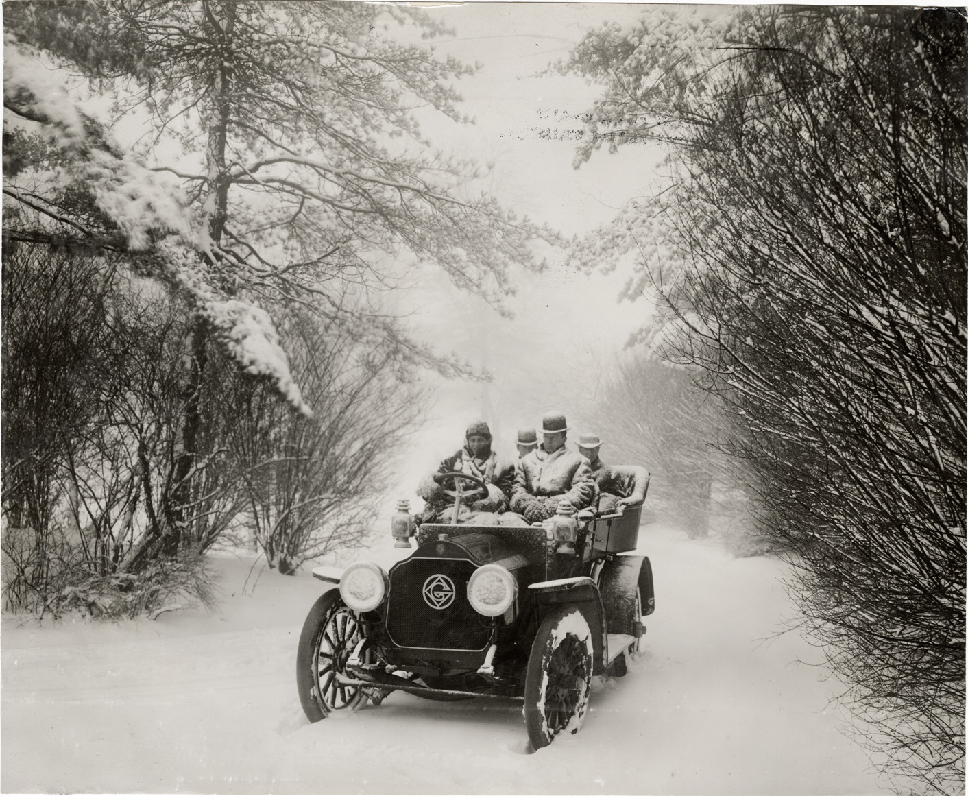 Motorists traveling in 1908 Garford automobile during snowstorm