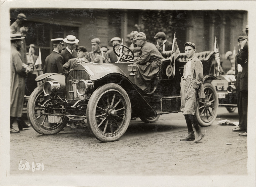 View of motorists in Great Western car no. 18. Teenage boy stands next to car in foreground. Stamped on back: "Spooner & Wells, Inc., photographers, telephones 3472-3473 Columbus, 1931 Broadway, New York." Handwritten on back: "Great Western, ca. 1910."