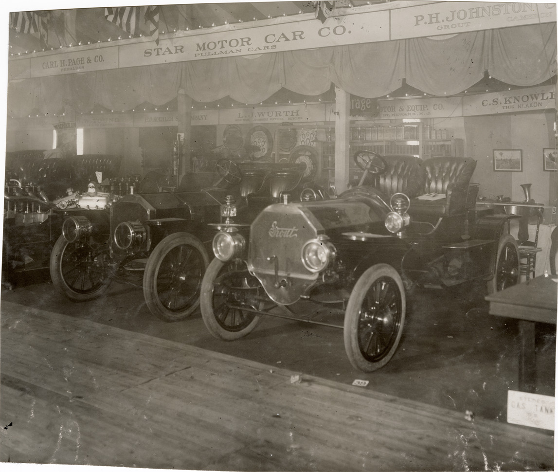 View of a Grout car on display at trade show. "P.H. Johnston, Grout" sign above exhibit. Stamped on back: "Spooner and Wells, 1931 Broadway, New York, duplicates any time, enlargements all sizes, tel. 3472-3473 Col., credit appreciated." Handwritten on back: "Grout, abt. 1908."