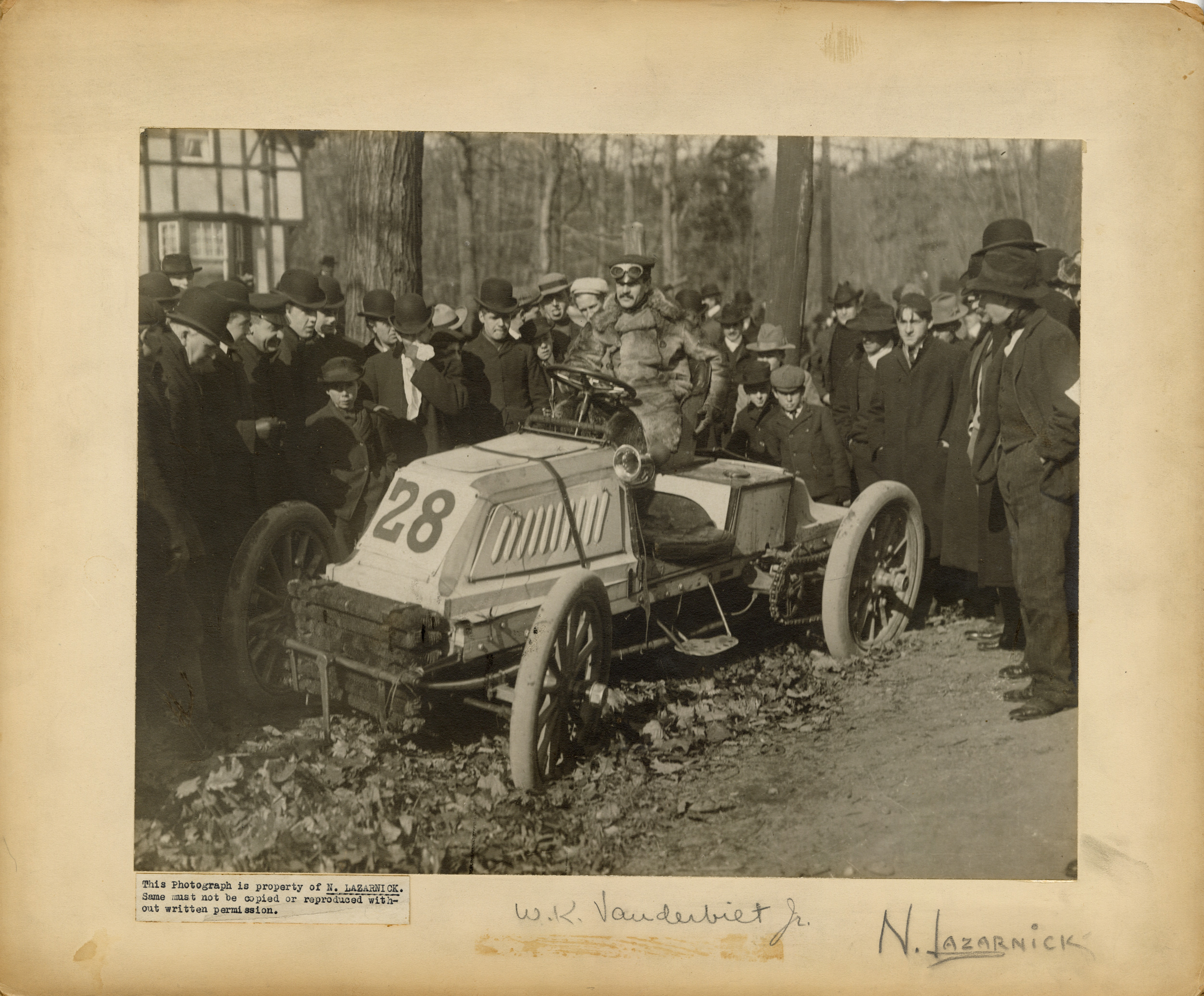 View of William K. Vanderbilt, Jr. posing in car no. 28. Spectators in background. Label on front: "This photograph is property of N. Lazarnick. Same must not be copied or reproduced without written permission." Handwritten on front: "W.K. Vanderbilt, Jr. N. Lazarnick." Stamped on back: "Photographic illustration by Nick Lazarnick, 230 Park Ave., N.Y." and "Photo by N. Lazarnick." Handwritten on back: "WK Vanderbilt."
