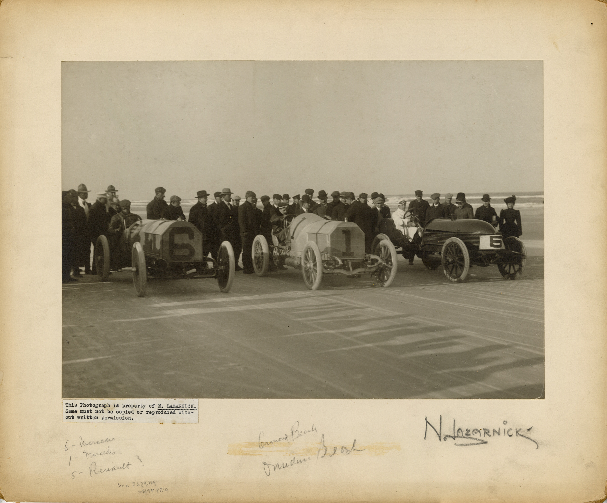 View of drivers in cars no. 1, no. 6 and no. 5 at Ormond-Daytona Beach; spectators stand behind cars. Label on front: "This photograph is property of N. Lazarnick. Same must not be copied or reproduced without written permission." Handwritten on front: "N. Lazarnick. 6, Mercedes. 1, Mercedes. 5, Renault? Ormond Beach. See R629.109 S839p p.210." Stamped on back: "Photographic illustration by Nick Lazarnick, 230 Park Ave., N.Y." and "Only the exclusive reproduction rights from this illustration are sold by Lazarnick." Handwritten on back: "Ormond Beach races, Florida."