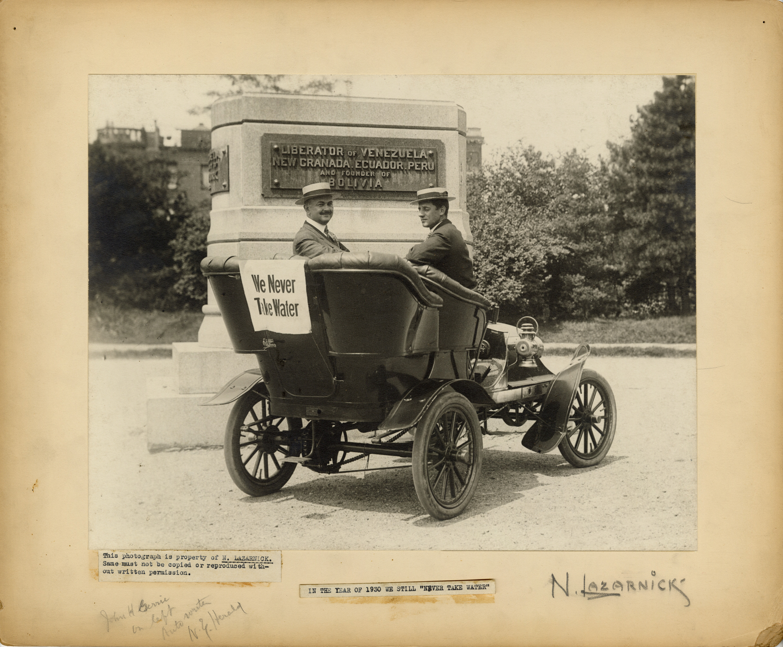 View of John H. Gerrie and unidentified man in Franklin car parked in front of pedestal for Simon Bolivar monument in Central Park. "We never take water" sign is displayed from rear seat. Label on front: "This photograph is property of N. Lazarnick. Same must not be copied or reproduced without written permission" and "In the year of 1930 we still never take water." Handwritten on front: "N. Lazarnick. John H. Gerrie on left, auto writer, N.Y. Herald." Stamped on back: "Photographic illustration by Nick Lazarnick, 230 Park Ave., N.Y." and "Only the exclusive reproduction rights from this illustration are sold by Lazarnick."