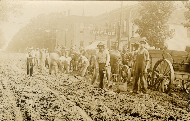 View of men digging in a muddy dirt road, alongside two horse-drawn wagons. Garage and other commercial buildings in background.
